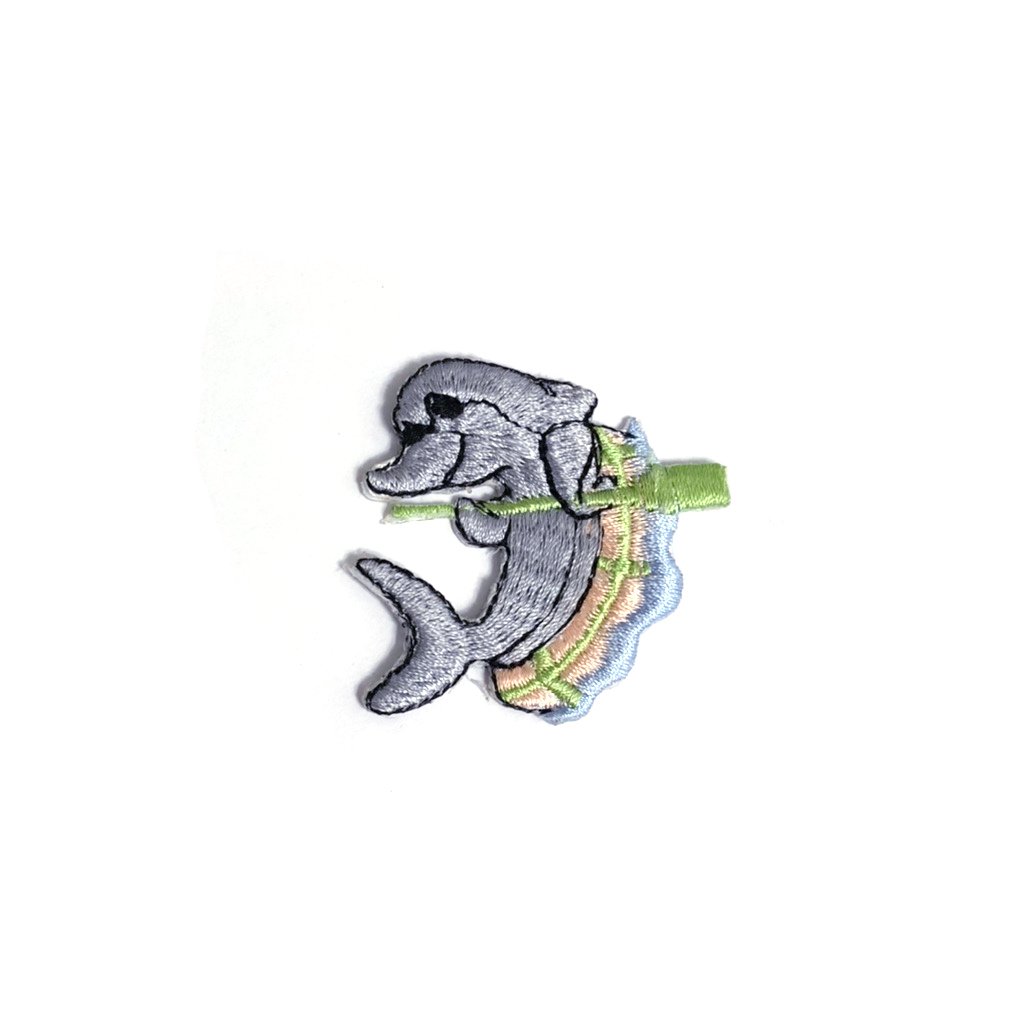 $ 0.33 / pieceGrey dolphin on green and beige boat in blue water iron-on garment sticker by piece – size 50 mm