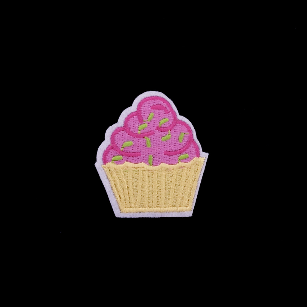 Pink green and yellow cupcake on white iron-on garment sticker by piece – size 42 x 49 mm