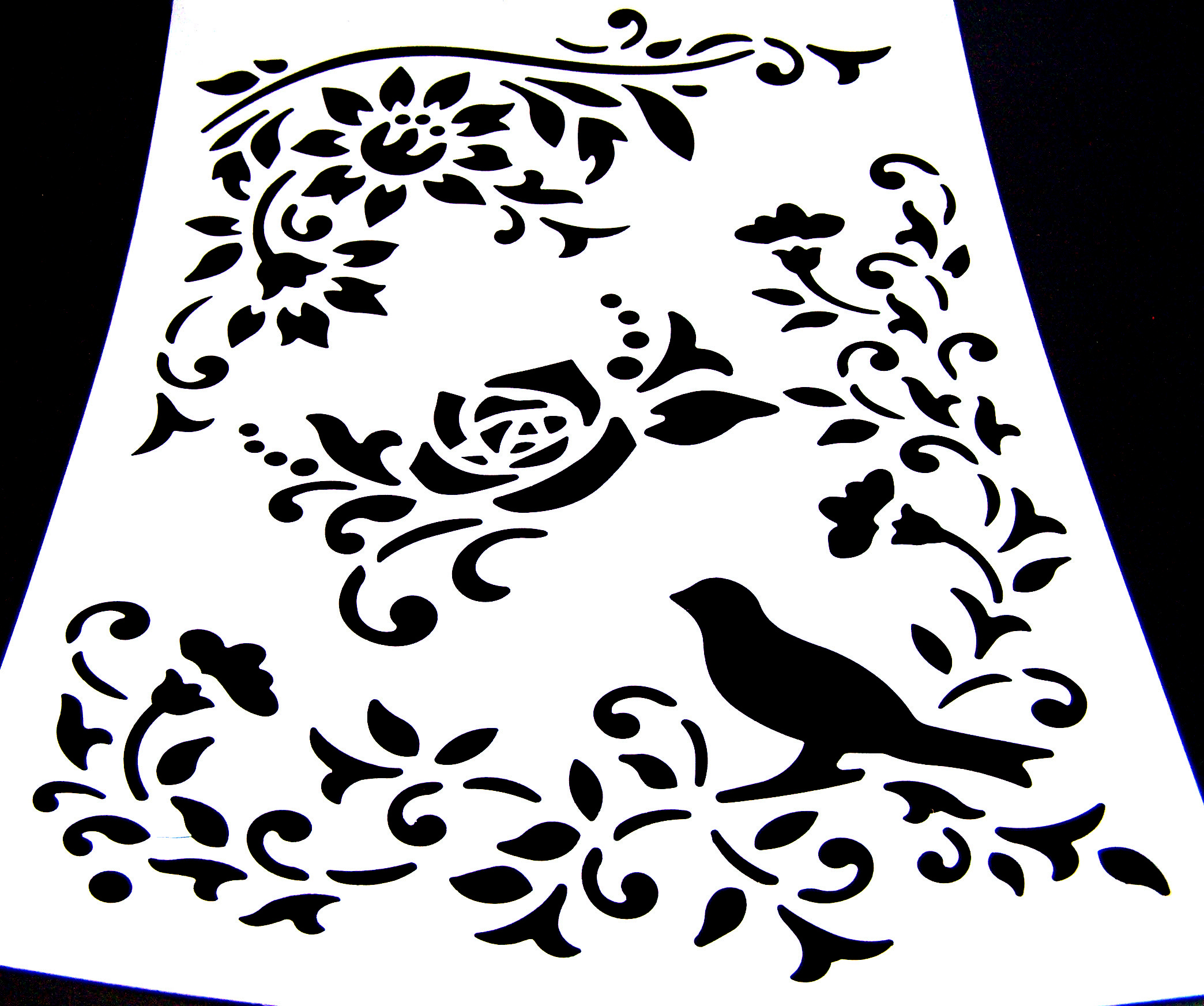 White plastic stencil depicting bird and flowers – size А4