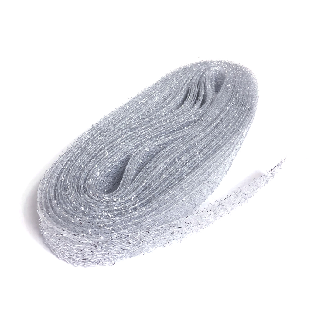 $ 2.11 / approximately 15 metresSOLDGlittery elastic mesh net hard silvery nylon ribbon by roll – width 28 mm – approximately 15 metres long