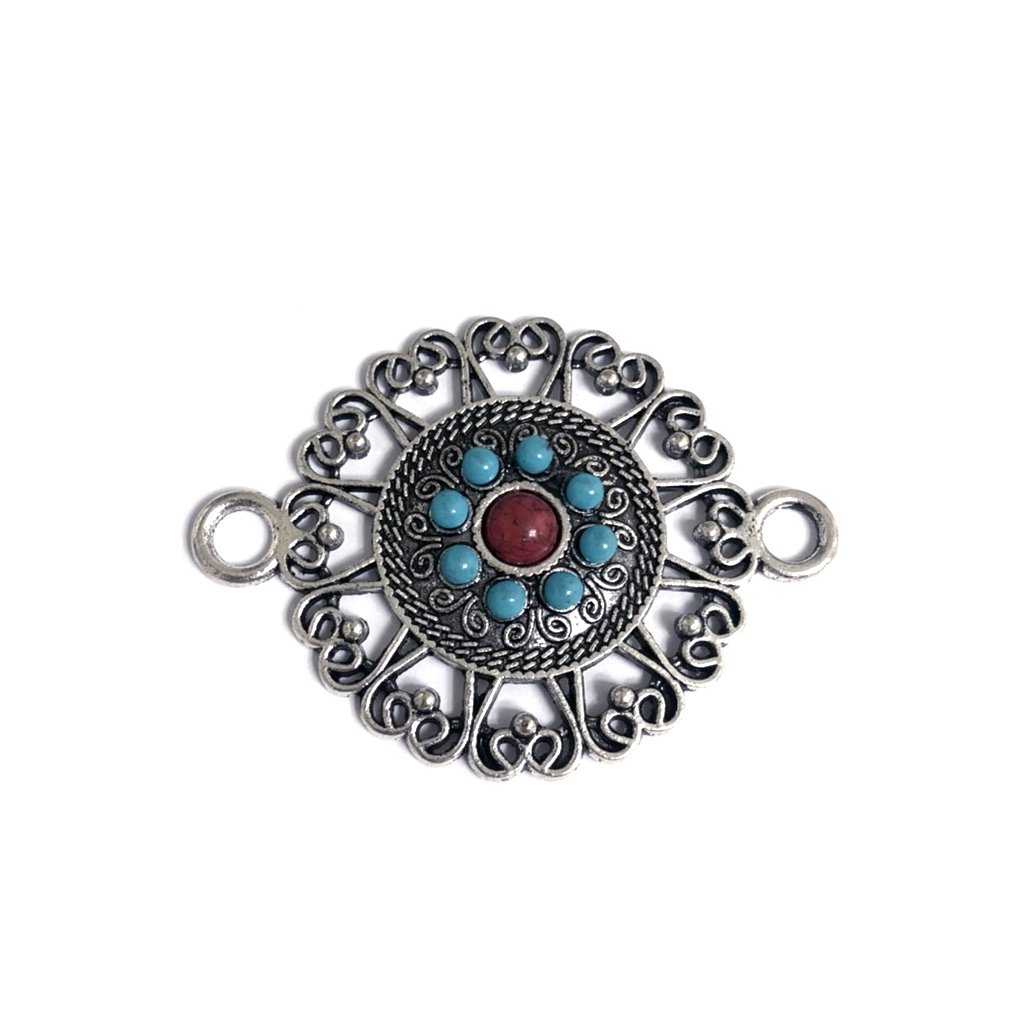 Round silvery metal connector with red and blue cabochons – size 39 x 53 mm