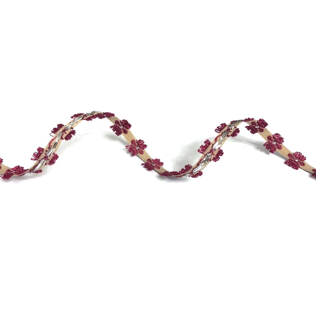 Cream yellow ribbon with dark red embroided flowers and silvery dots by metre – width 13 mm