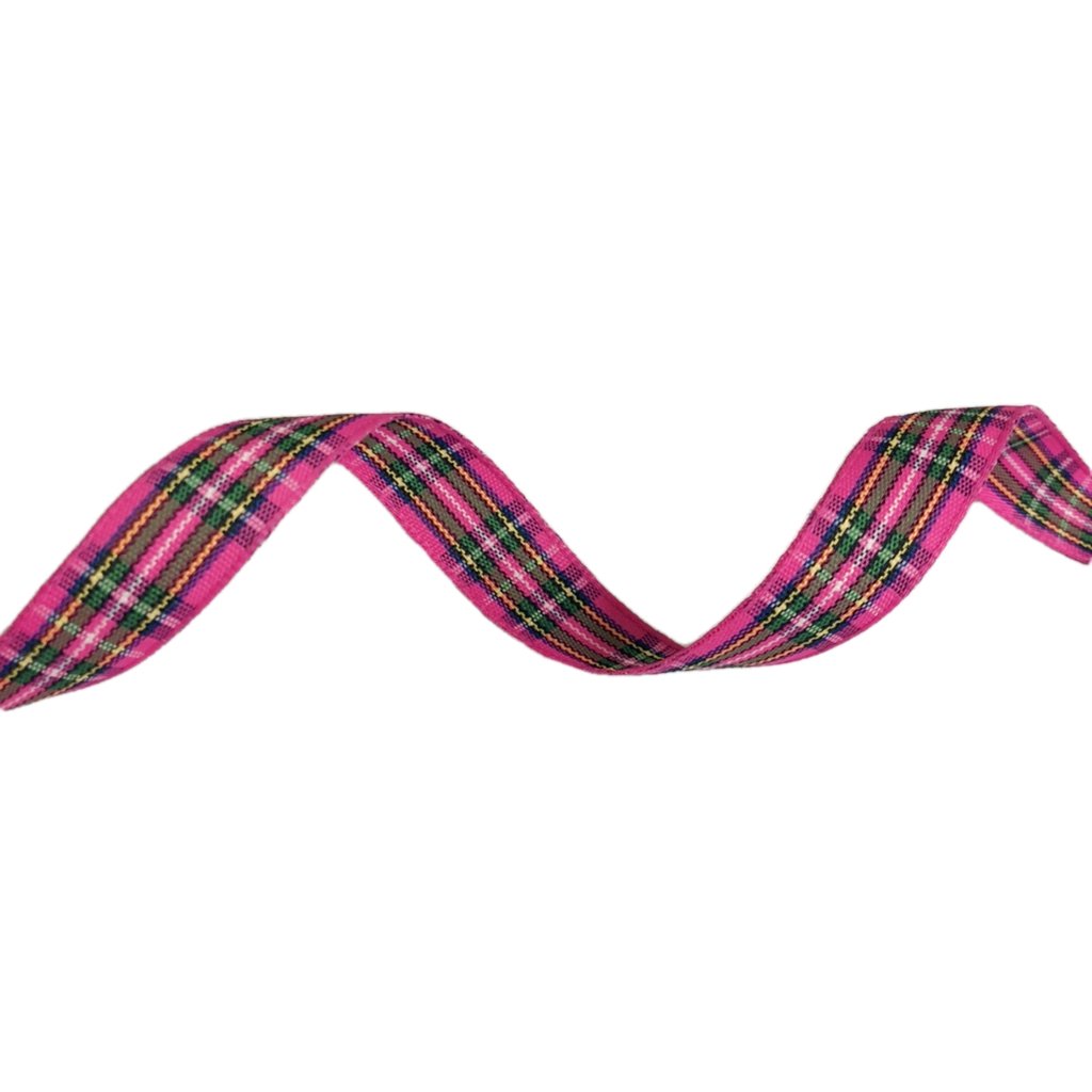 Pink polyester ribbon with green yellow white and blue plaid pattern by metre – width 15 mm