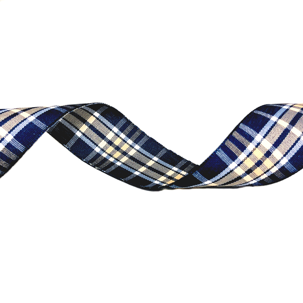 $ 0.25 / metreNavy polyester ribbon with white and beige plaid pattern by metre – width 26 mm